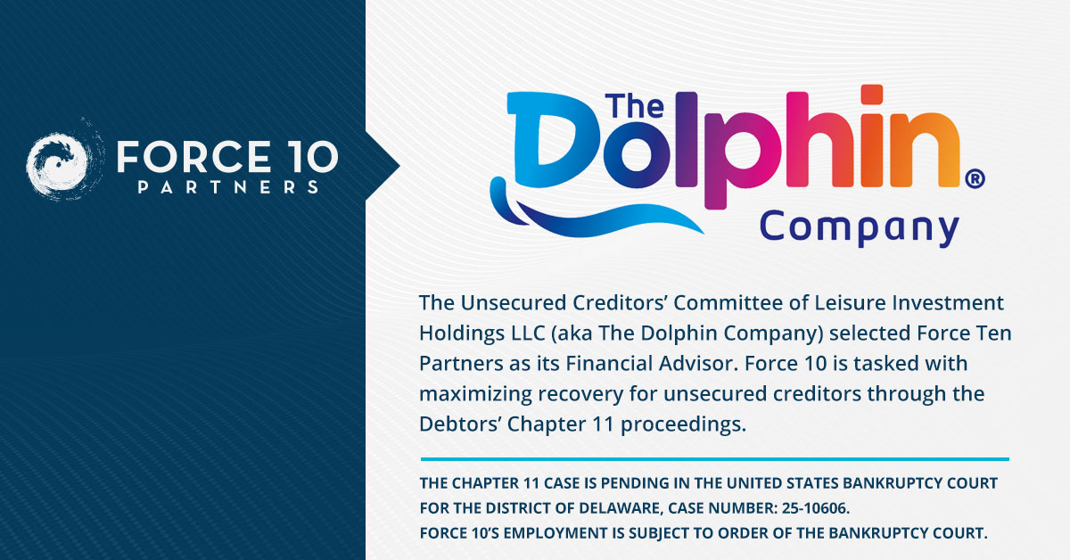 The Unsecured Creditors’ Committee of Leisure Investment Holdings LLC (aka The Dolphin Company) selected Force Ten Partners as its Financial Advisor. Force 10 is tasked with maximizing recovery for unsecured creditors through the Debtors’ Chapter 11 proceedings.